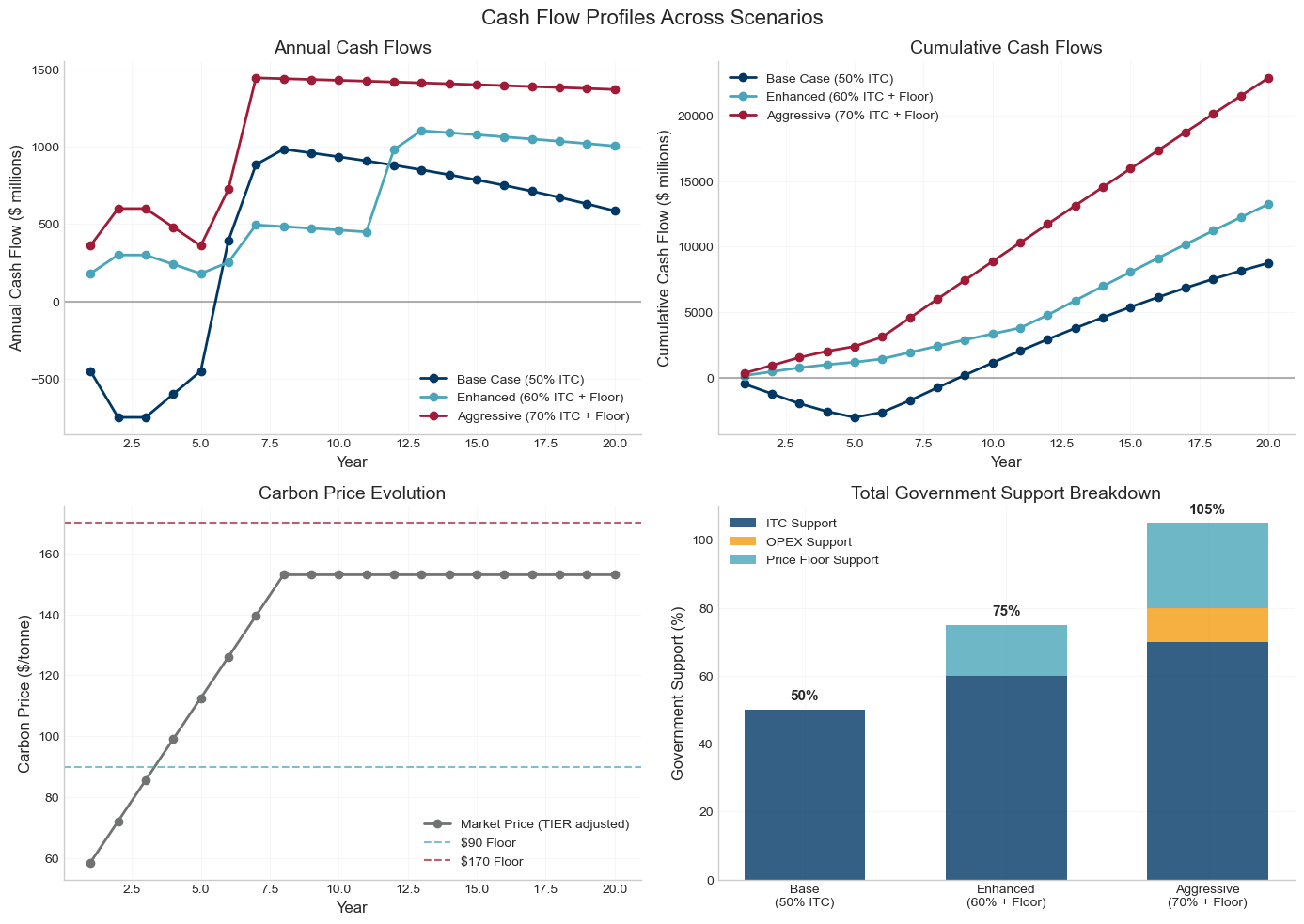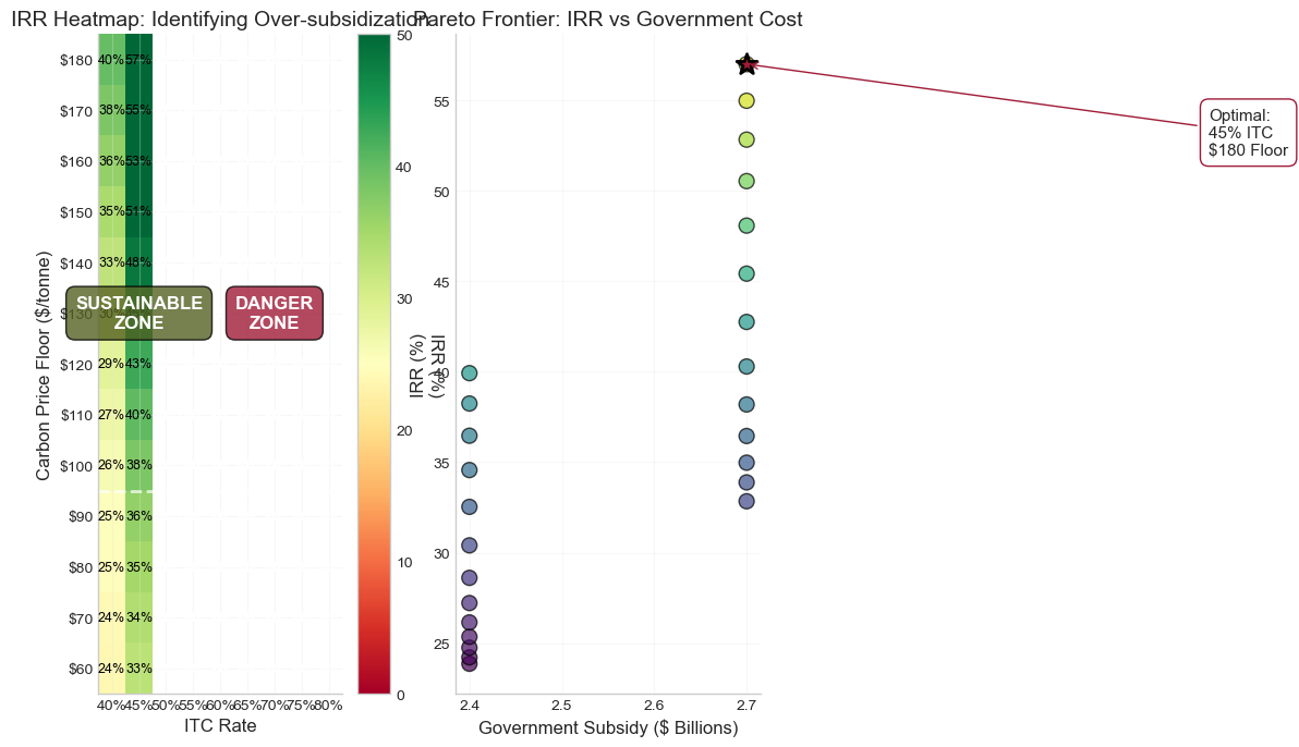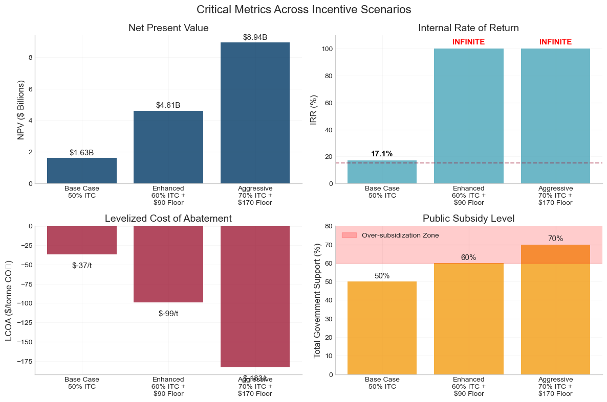 Key Finding: While a 50% Investment Tax Credit yields sustainable 17% returns, combining high ITC rates with price floor guarantees creates infinite IRRs, signaling dangerous over-subsidization that would transfer excessive value from taxpayers to producers.