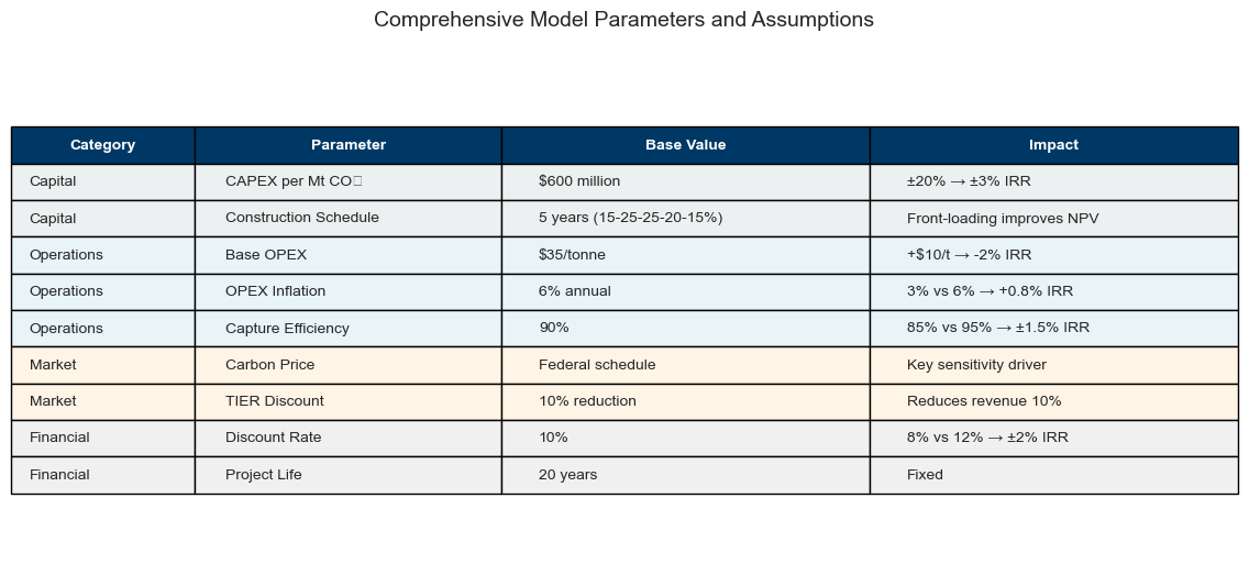 Operational realities matter: Including TIER discounts, capture efficiency, and OPEX inflation significantly impacts project economics